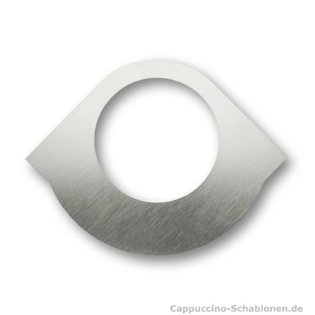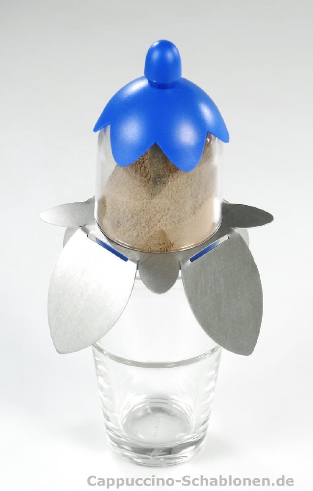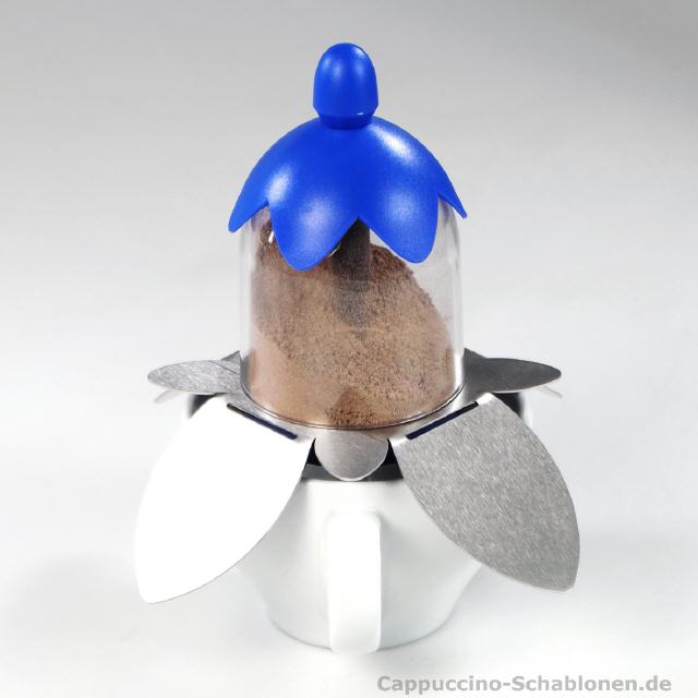 Die vier großen Blätter lassen sich von Hand exakt so weit nach unten biegen, dass der Kakaostreuer genau auf der Oberkante der Tasse platziert wird. Es gibt kein Verwackeln und ein Kakaoabdruck wird genau so wie der andere.