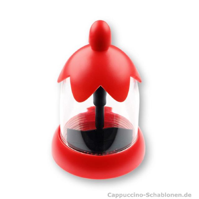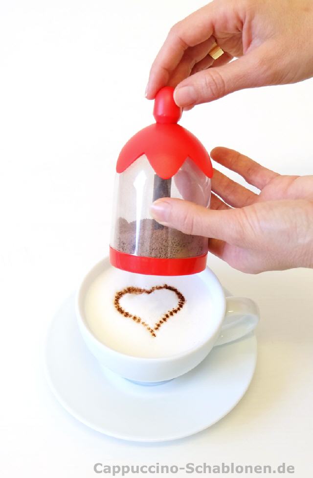 Der Vorteil gegenüber Handschablonen liegt darin, dass dieser Streuer bereits mit Kakao gefüllt neben der Kaffee- oder Espressomaschine wartet. So gelingt die Dekoration eines feinen Cappuccinos oder Latte Macchiatos im Handumdrehen - sauber und schnell.