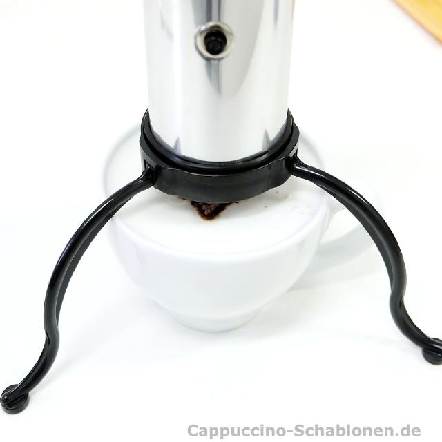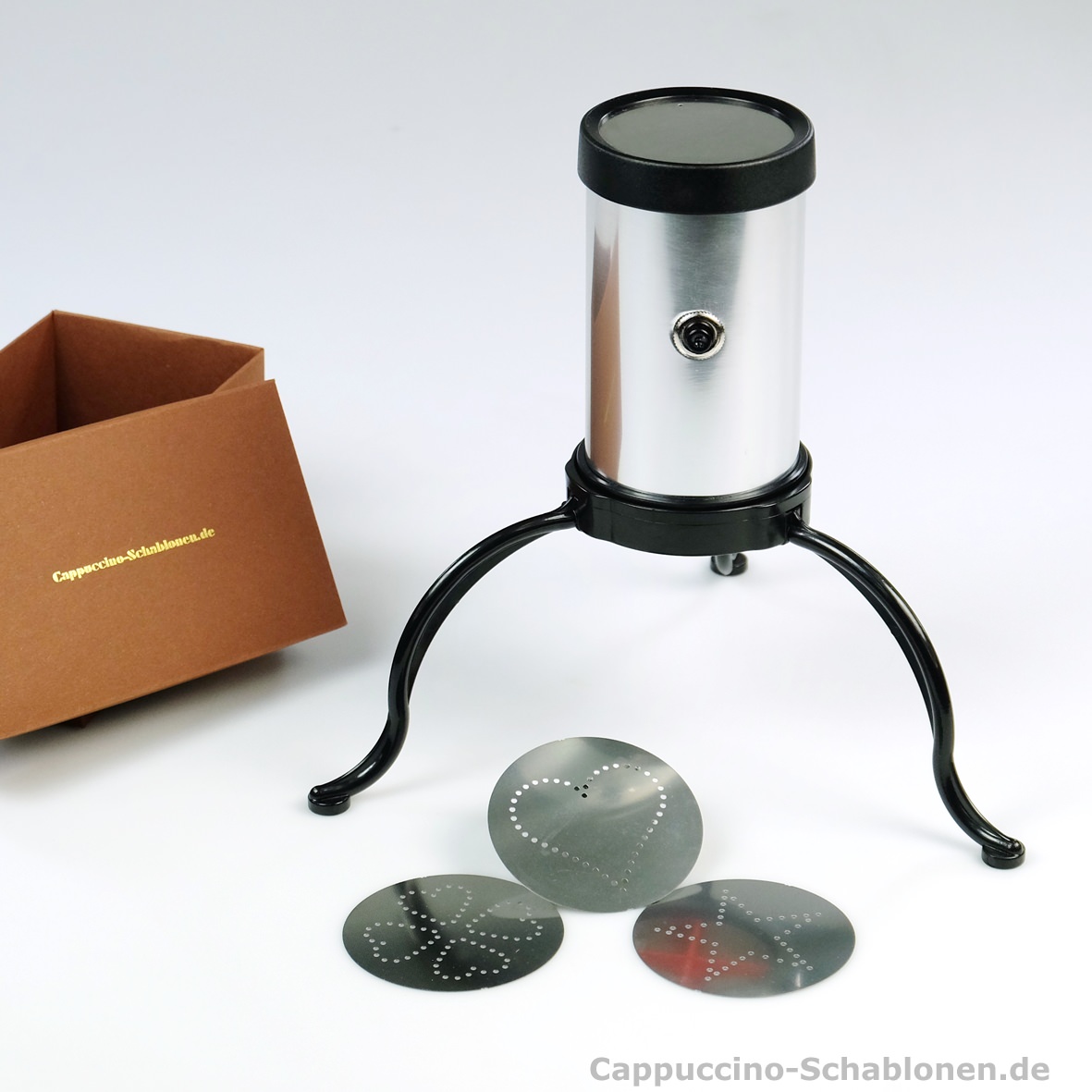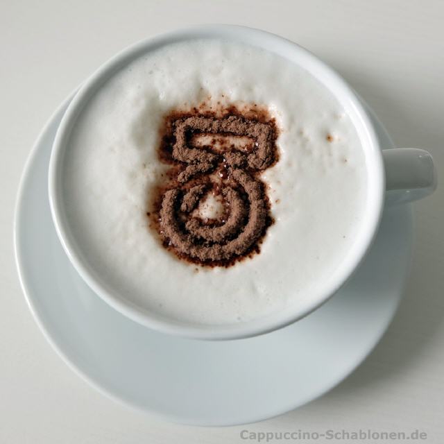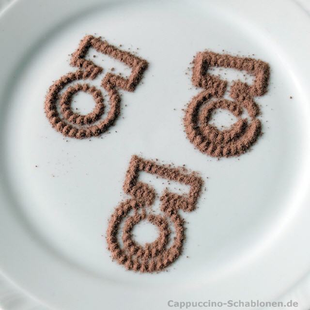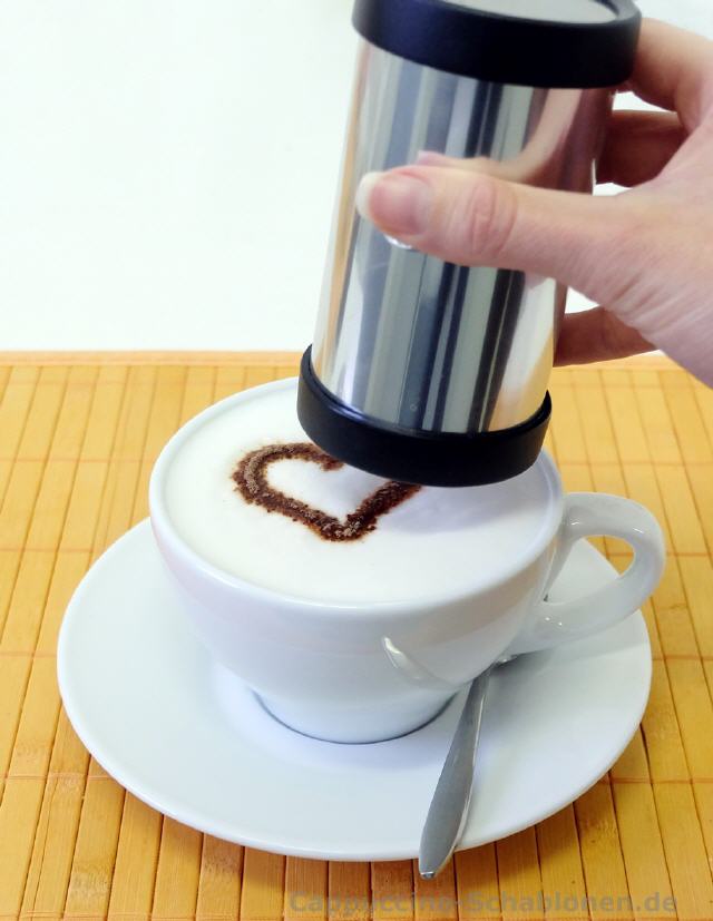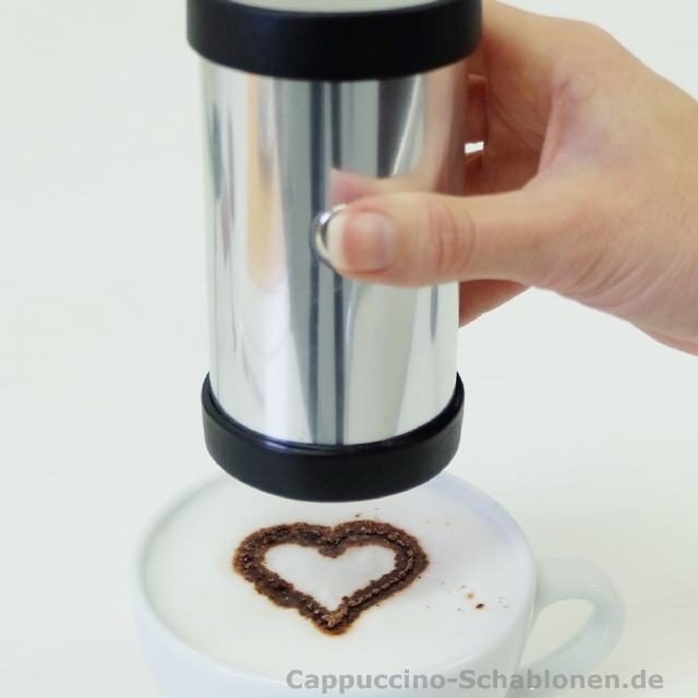 Der elektrische Cappuccino-Streuer: standardmäßig mit den drei neutralen Motiven Kleeblatt, Stern und Herz.