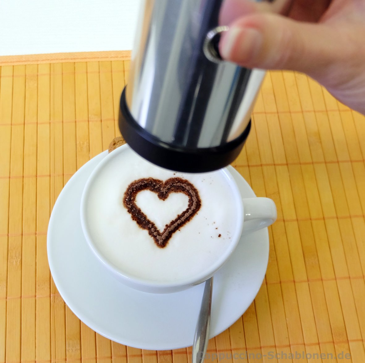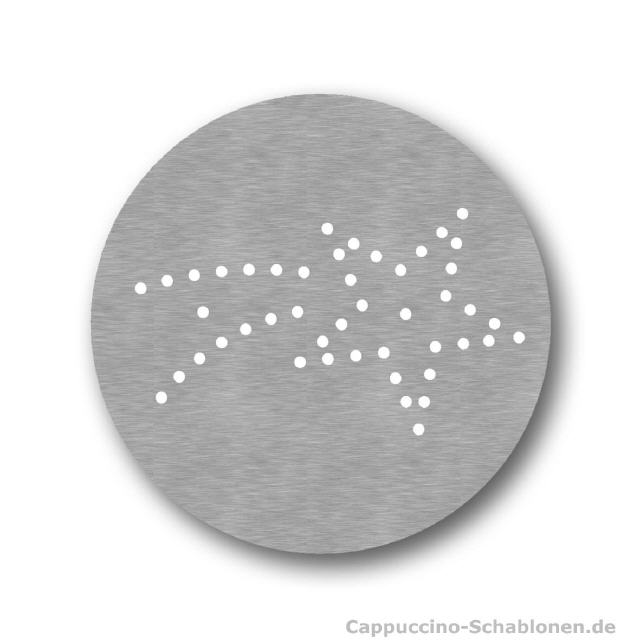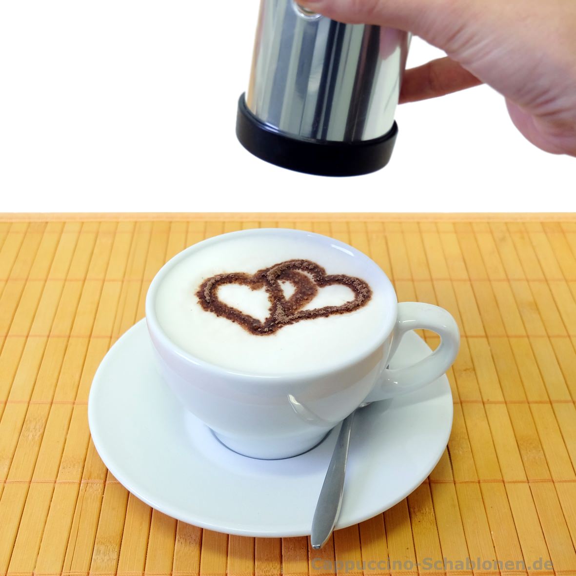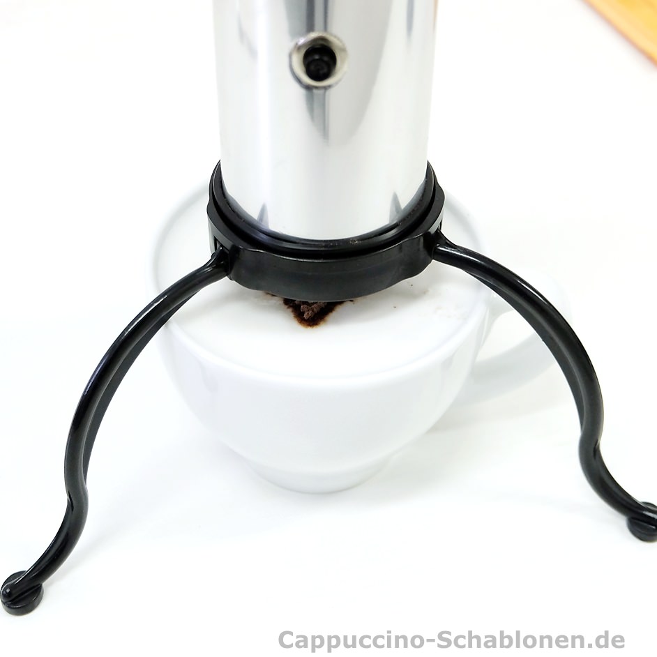 Der elektrische Cappuccino-Streuer: standardmäßig mit den drei neutralen Motiven Kleeblatt, Stern und Herz.