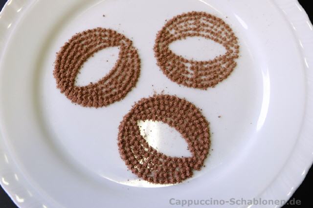 Bei mechanischen Kakaostreuern sind vor allem einfache Motive umsetzbar, da der Durchmesser des im Streuer befindlichen Einsatzes weitaus kleiner ist, als der Durchmesser einer Standard-Handschablone.
